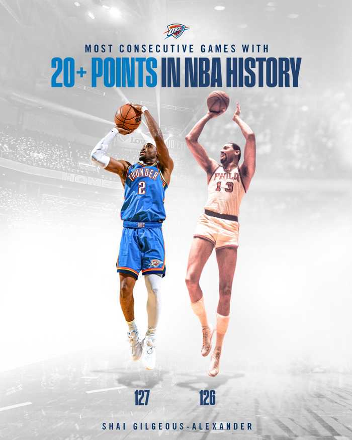 在亚历山大完成20+后,雷霆官方写道:时隔63年再度创造一项新的纪录。